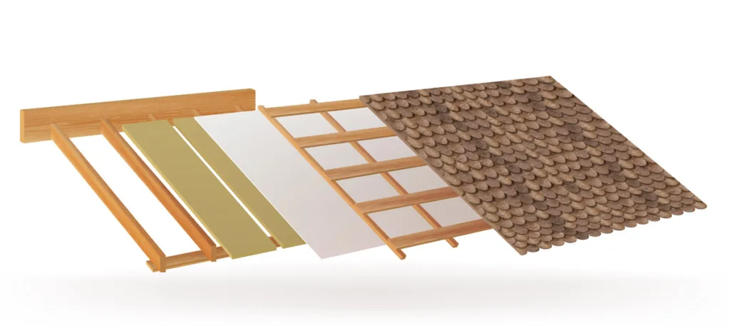 This is called the “decking” and serves as the base layer. The decking can be made of boards or sheets, often plywood, which is laid onto beams or rafters. The decking creates the frame and ensures the proper functioning of other roof components. If the decking elements rot or get damaged, they need to be replaced. However, defects cannot be identified without removing the old roof.
