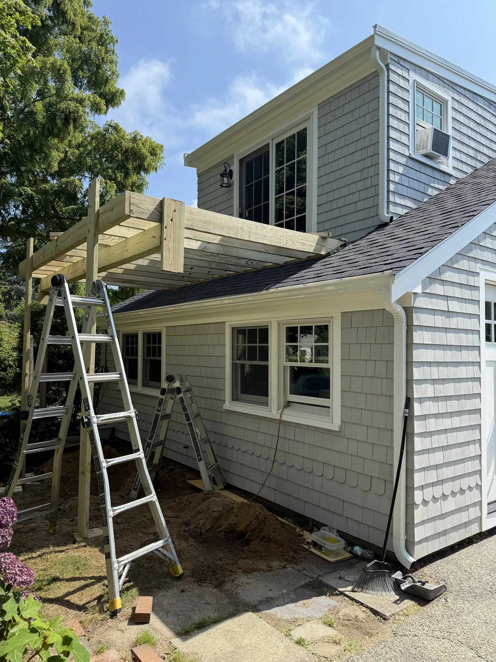 For the siding, we installed natural white cedar shingles throughout. Fresh out of install, the characteristic honey-blonde tone gives the home warmth and authenticity — and over time it will silver into the classic Cape Cod gray that belongs in this region. The coursing is tight and consistent across every elevation, with decorative scalloped shingles along the base course adding a traditional detail that fits the Cape-style architecture perfectly.